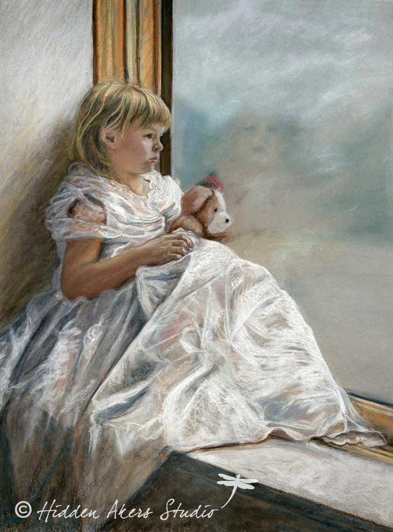 “Girl in Wedding Dress”¸18” x 24”, Drawn from my daughter posing, playing dress up in a wedding dress. Pastel on paper. Prints available for sale.