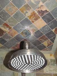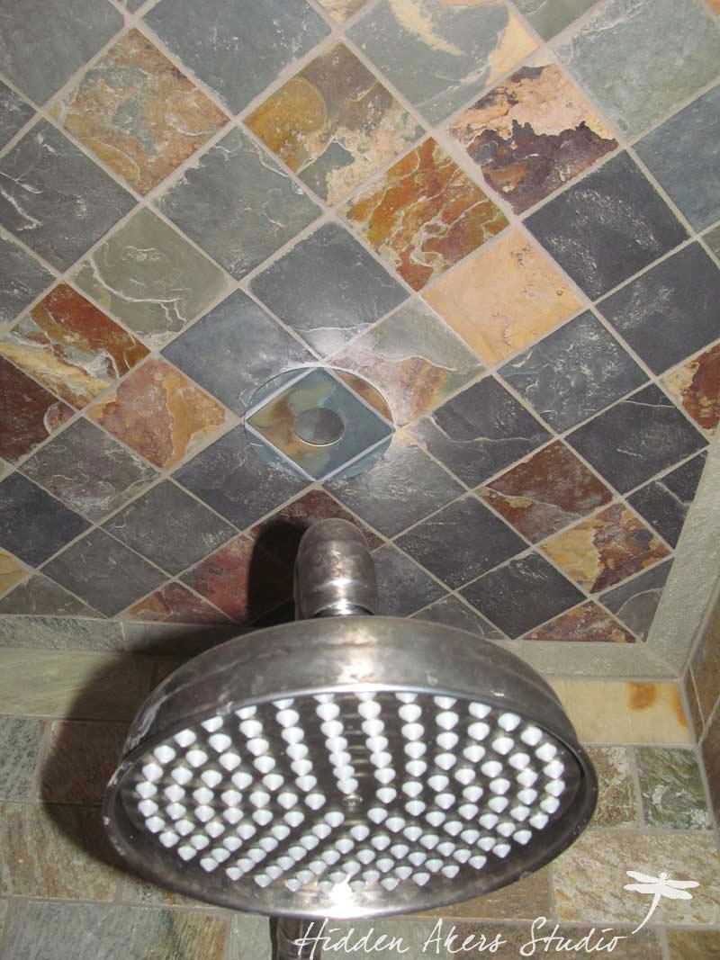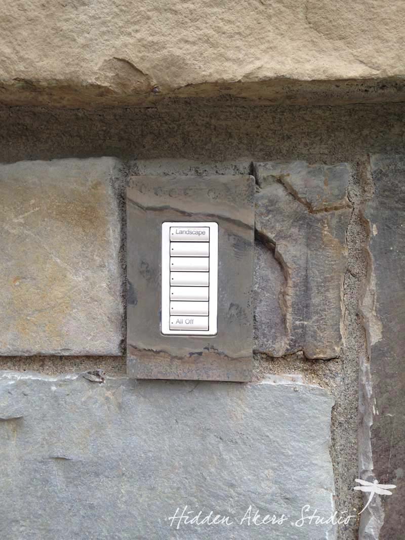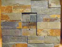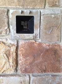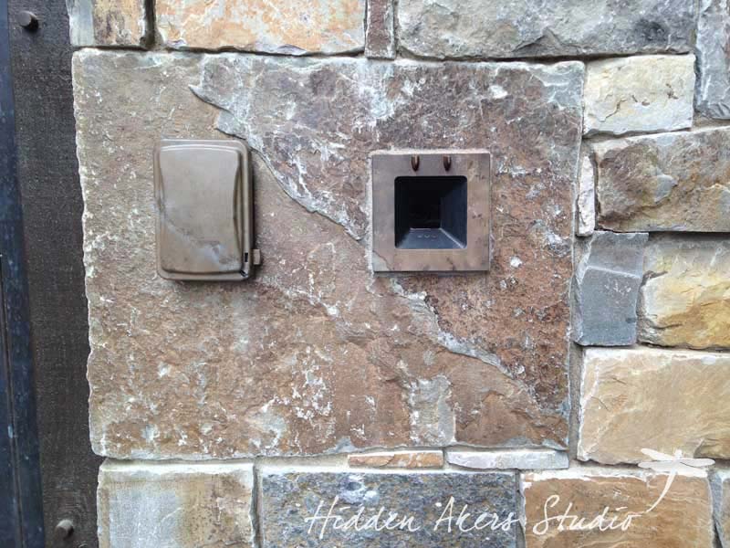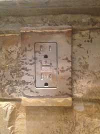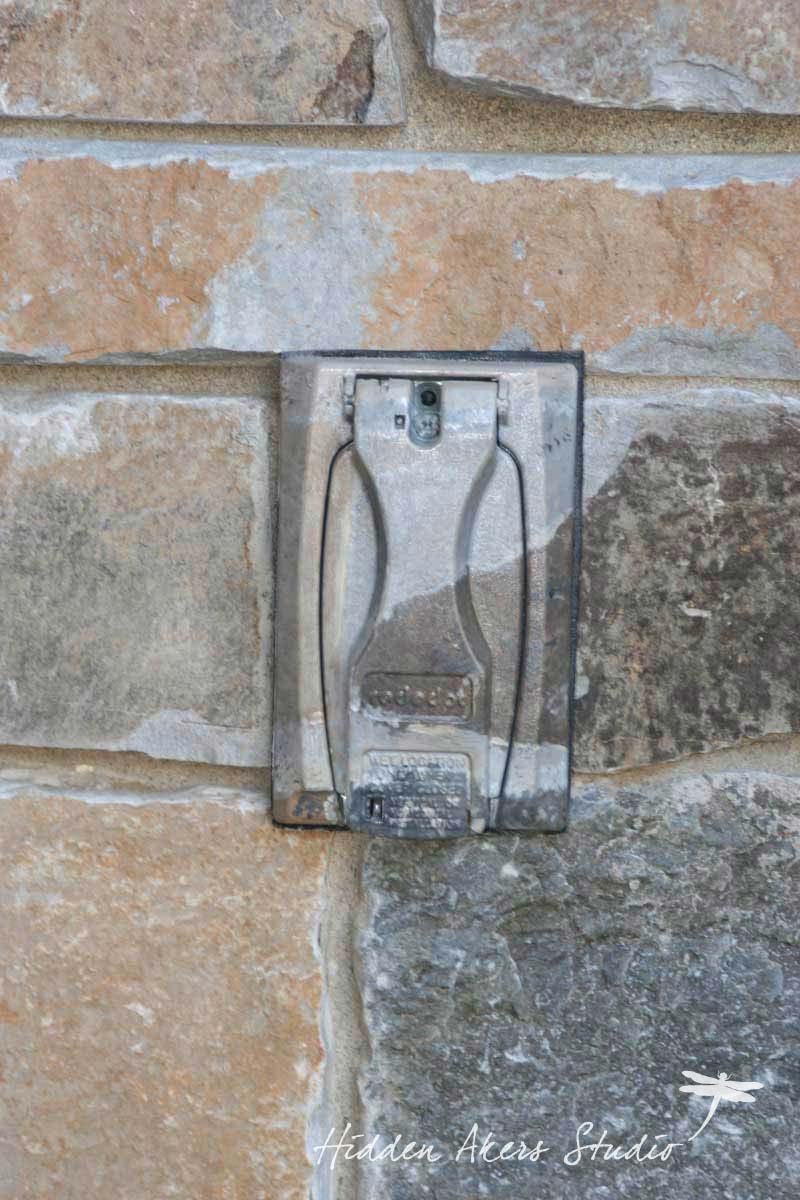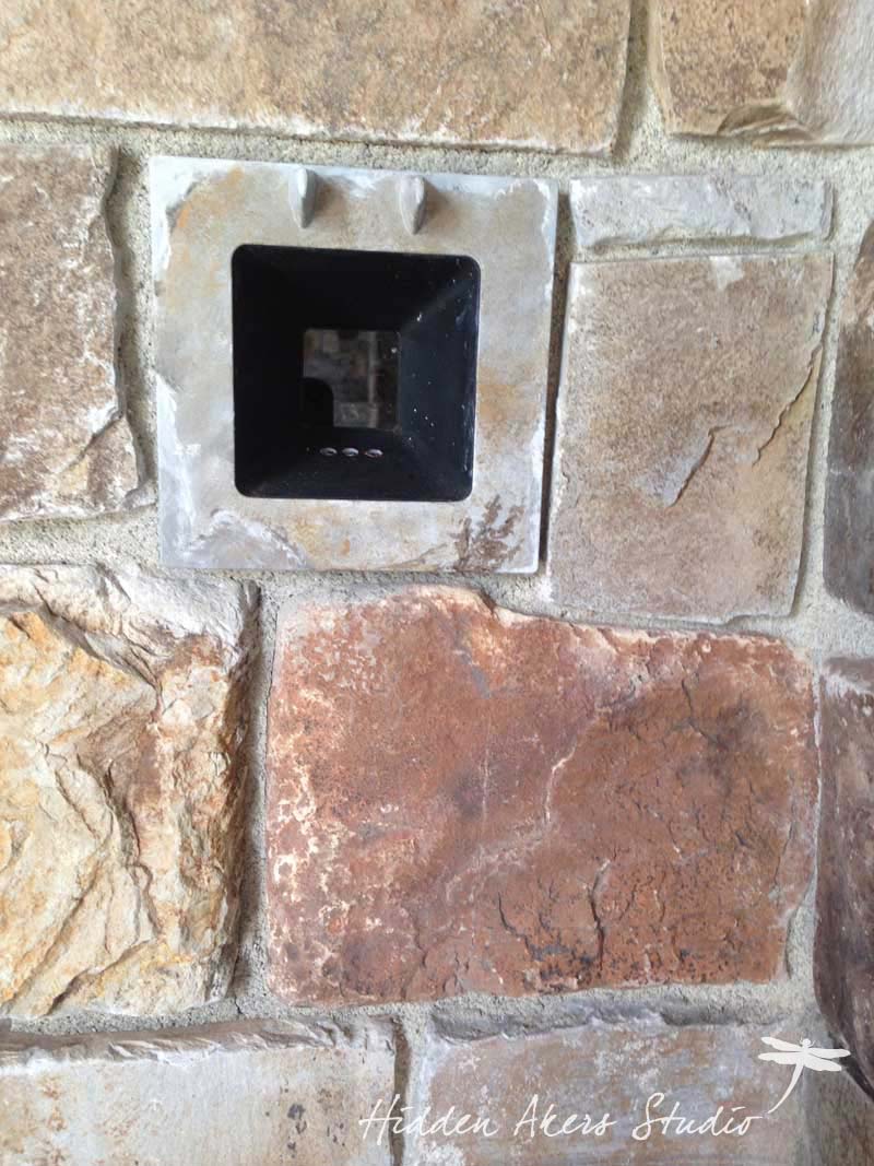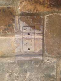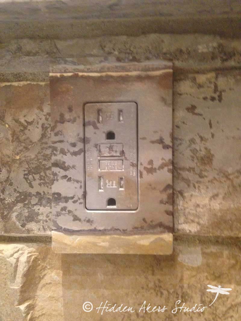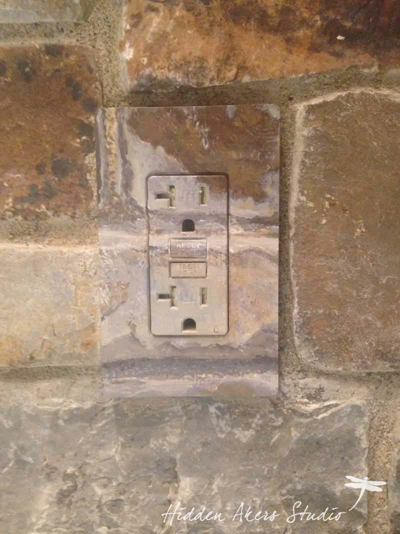 This stone outlet was faux painted in a bathroom with stone wainscoting, complimenting the rustic decor.