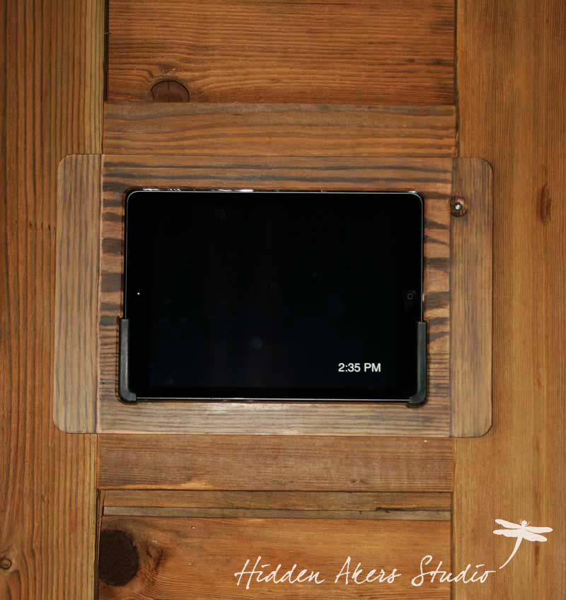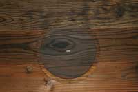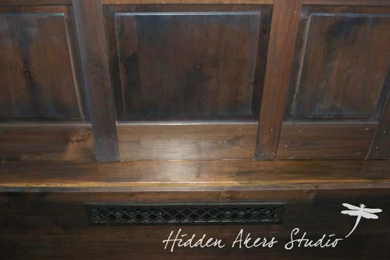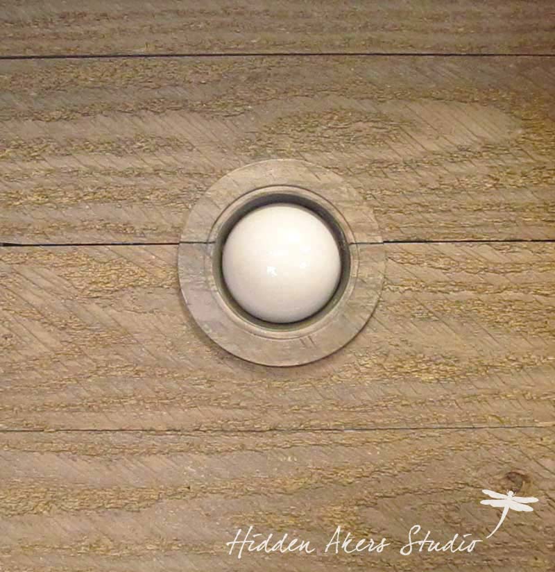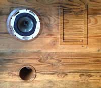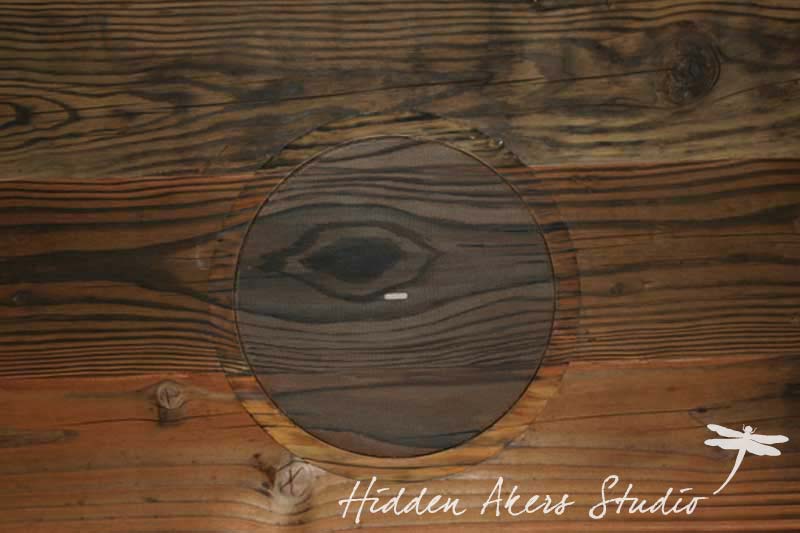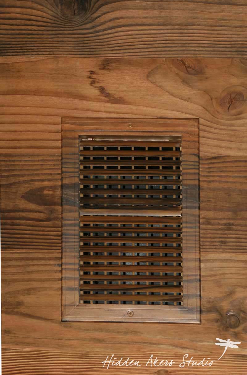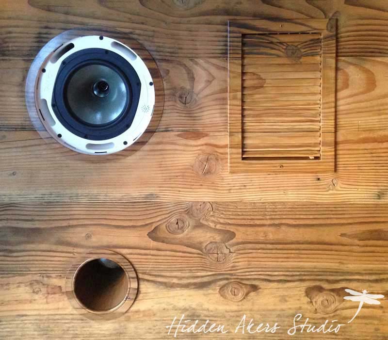 A white speaker cover in a barn wood ceiling gracefully recedes into the background with faux painting.